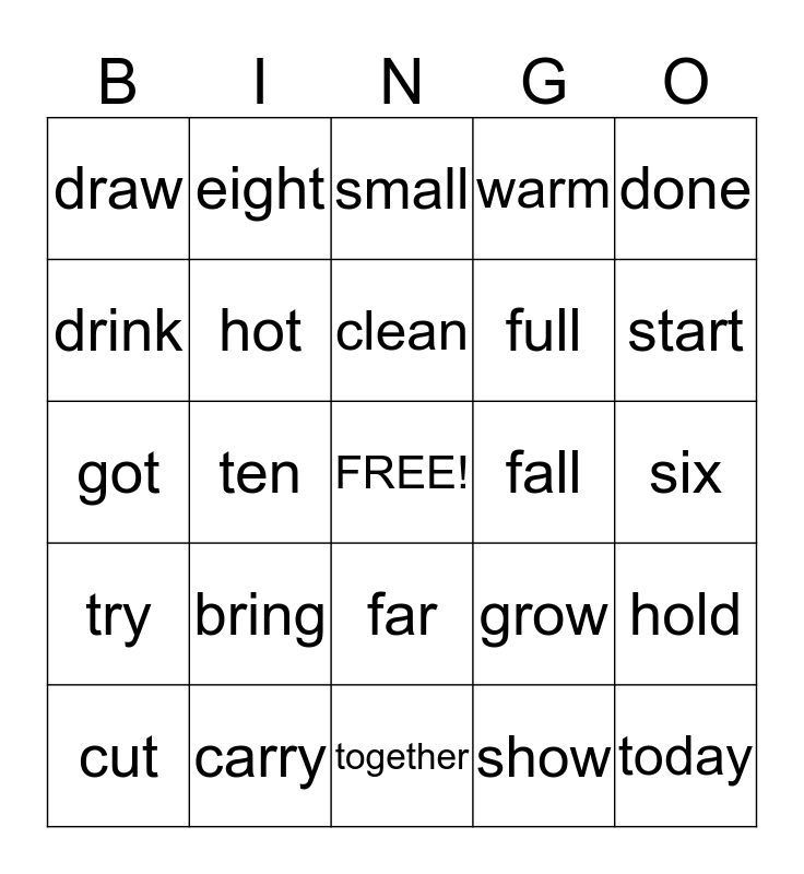 This bingo card has a free space and 24 words: bring, carry, clean, cut, done, draw, drink, eight, fall, far, full, got, grow, hold, hot, show, six, small, start, ten, today, try, warm and together.