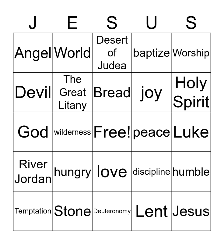 This bingo card has a free space and 24 words: hungry, Stone, Bread, Temptation, Worship, Angel, Devil, World, peace, love, joy, God, discipline, humble, The Great Litany, Lent, Luke, Desert of Judea, Holy Spirit, wilderness, Jesus, River Jordan, baptize and Deuteronomy.