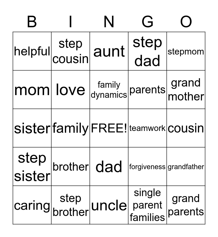 This bingo card has a free space and 24 words: brother, step brother, family dynamics, caring, stepmom, helpful, mom, step cousin, teamwork, dad, parents, sister, forgiveness, grandfather, love, single parent families, cousin, aunt, grand mother, family, grand parents, step sister, step dad and uncle.