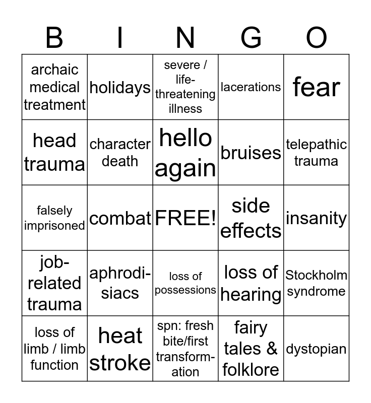 This bingo card has a free space and 24 words: aphrodi-siacs, heat stroke, hello again, loss of limb / limb function, fear, archaic medical treatment, head trauma, holidays, side effects, loss of possessions, bruises, falsely imprisoned, loss of hearing, Stockholm syndrome, character death, fairy tales & folklore, insanity, severe / life-threatening illness, telepathic trauma, combat, dystopian, job-related trauma, lacerations and spn: fresh bite/first transform-ation.