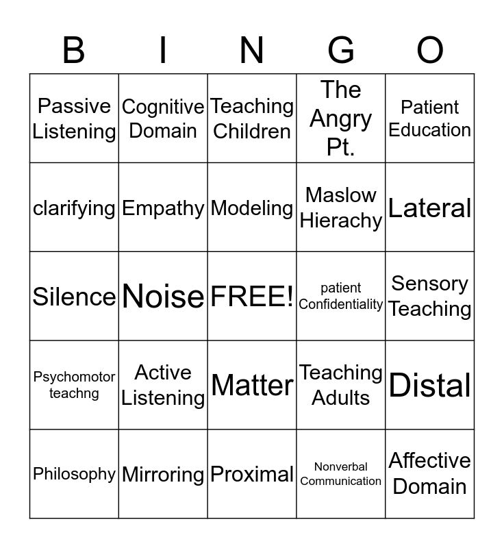 This bingo card has a free space and 24 words: Active Listening, Mirroring, Modeling, Philosophy, Patient Education, Passive Listening, clarifying, Cognitive Domain, patient Confidentiality, Matter, Maslow Hierachy, Silence, Teaching Adults, Distal, Empathy, Nonverbal Communication, Sensory Teaching, Teaching Children, Lateral, Noise, Affective Domain, Psychomotor teachng, The Angry Pt. and Proximal.