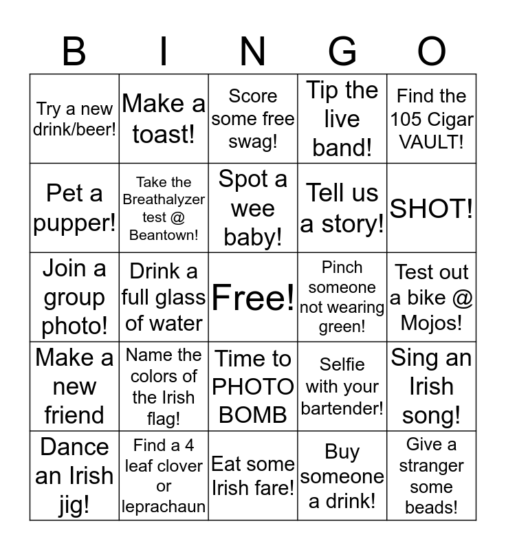 This bingo card has a free space and 24 words: Name the colors of the Irish flag!, Find a 4 leaf clover or leprachaun, Spot a wee baby!, Dance an Irish jig!, Find the 105 Cigar VAULT!, Try a new drink/beer!, Pet a pupper!, Make a toast!, Pinch someone not wearing green!, Time to PHOTO BOMB, Tell us a story!, Join a group photo!, Selfie with your bartender!, Sing an Irish song!, Take the Breathalyzer test @ Beantown!, Buy someone a drink!, Test out a bike @ Mojos!, Score some free swag!, SHOT!, Drink a full glass of water, Give a stranger some beads!, Make a new friend, Tip the live band! and Eat some Irish fare!.