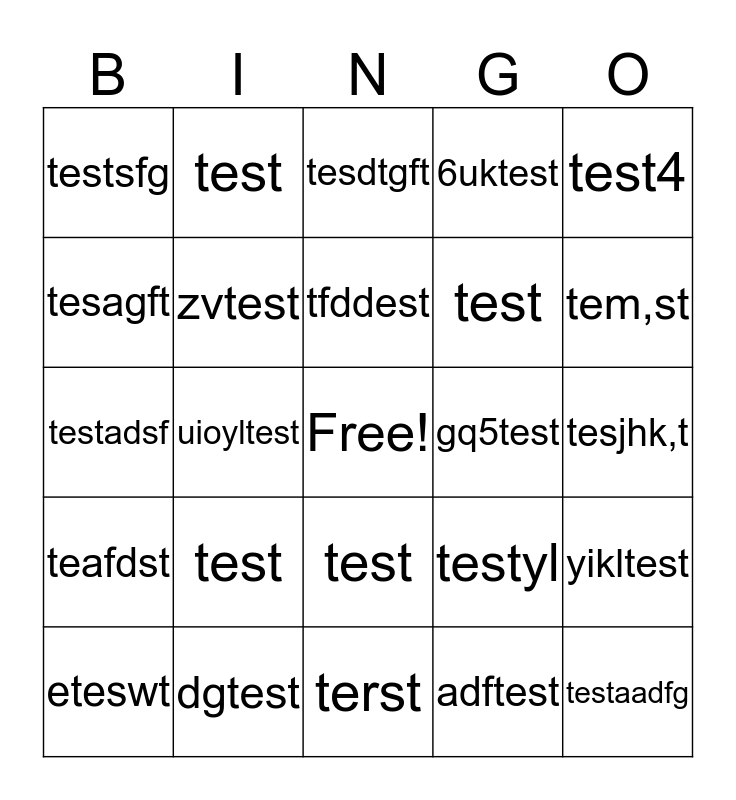 This bingo card has a free space and 24 words: test, dgtest, tfddest, eteswt, test4, testsfg, tesagft, test, gq5test, test, test, testadsf, testyl, yikltest, zvtest, adftest, tesjhk,t, tesdtgft, tem,st, uioyltest, testaadfg, teafdst, 6uktest and terst.