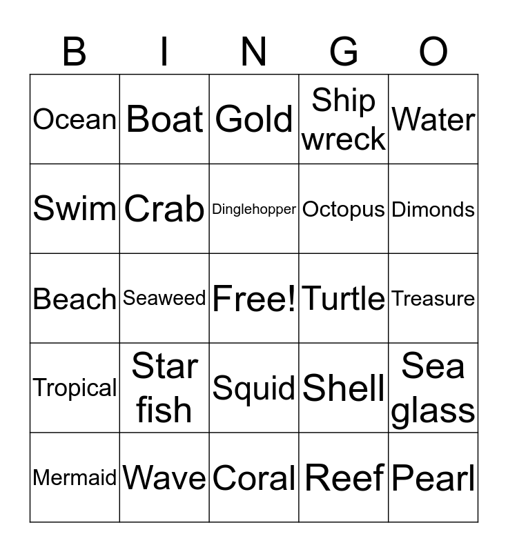 This bingo card has a free space and 25 words: Star fish, Coral, Dinglehopper, Mermaid, Water, Ocean, Swim, Boat, Turtle, Squid, Octopus, Beach, Shell, Sea glass, Crab, Guppy, Treasure, Gold, Dimonds, Seaweed, Pearl, Wave, Tropical, Ship wreck and Reef.