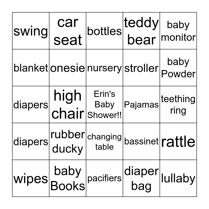This bingo card has a free space and 28 words: rattle, bibs, stroller, diaper bag, blanket, bottles, car seat, diapers, Pajamas, wipes, diapers, teddy bear, baby Books, pacifiers, baby Powder, baby Food, rubber ducky, onesie, nursery, changing table, swing, night light, lullaby, high chair, teething ring, bassinet, baby monitor and baby lotion.
