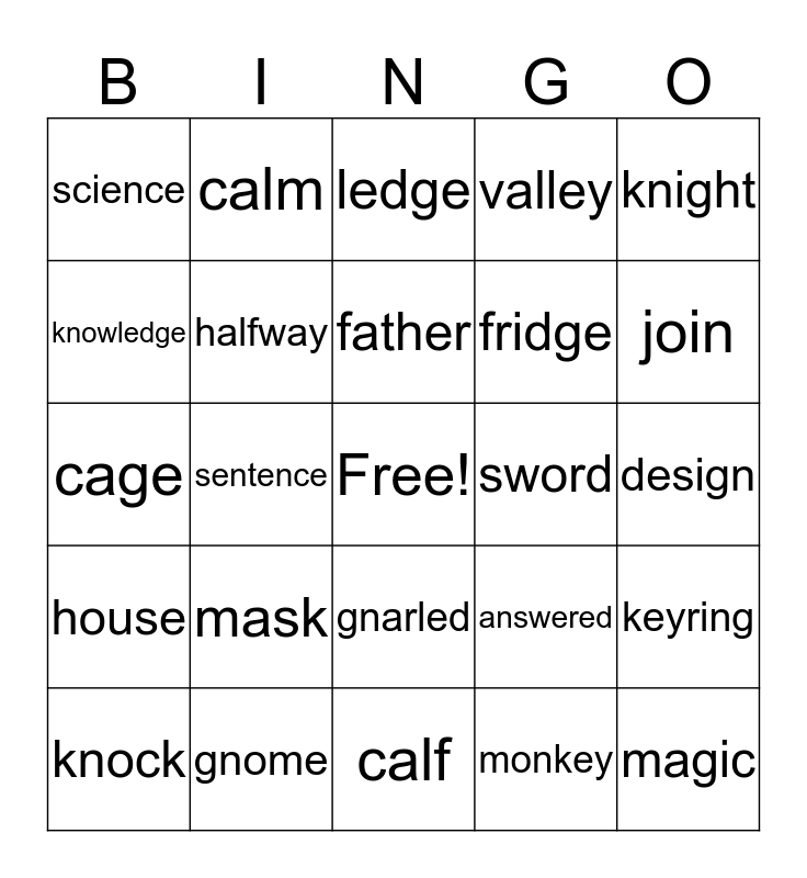 This bingo card has a free space and 25 words: mask, calf, father, knock, knight, science, knowledge, calm, sword, gnarled, fridge, cage, answered, keyring, halfway, funny, design, ledge, join, sentence, magic, gnome, house, valley and monkey.