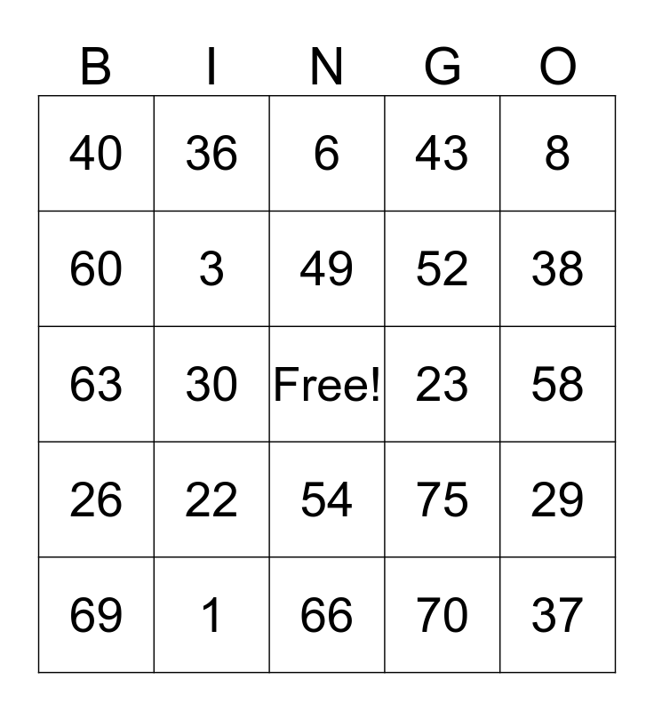 This bingo card has a free space and 24 words: 22, 1, 49, 69, 8, 40, 60, 36, 23, 54, 52, 63, 75, 29, 3, 70, 58, 6, 38, 30, 37, 26, 43 and 66.