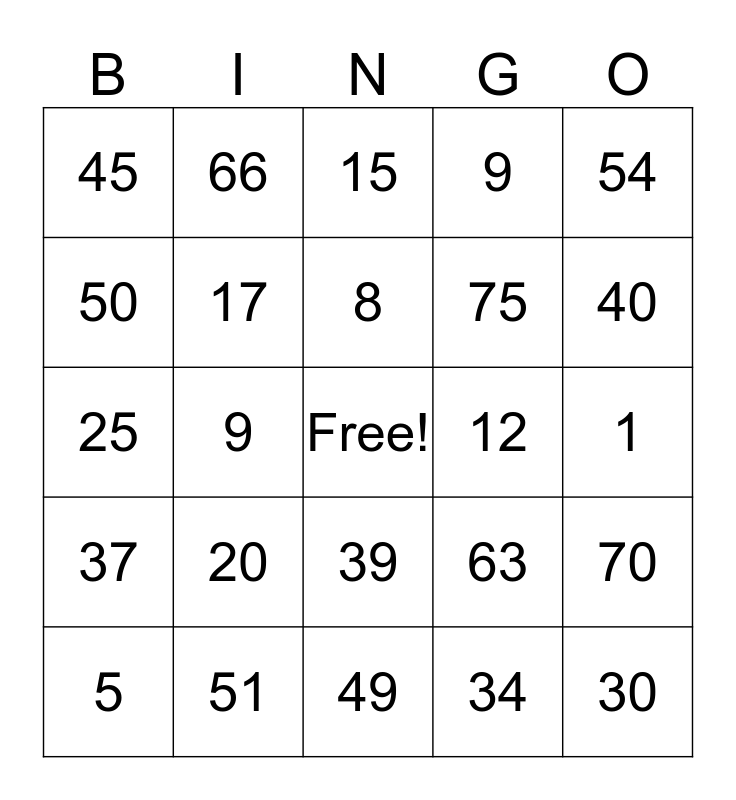 This bingo card has a free space and 24 words: 20, 51, 8, 5, 54, 45, 50, 66, 12, 39, 75, 25, 63, 70, 17, 34, 1, 15, 40, 9, 30, 37, 9 and 49.