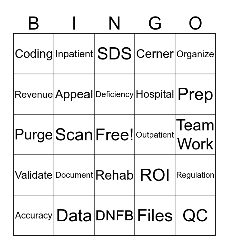 This bingo card has a free space and 24 words: Document, Data, Deficiency, Accuracy, Organize, Coding, Revenue, Inpatient, Outpatient, Rehab, Hospital, Purge, ROI, Regulation, Appeal, Files, Team Work, SDS, Prep, Scan, QC, Validate, Cerner and DNFB.