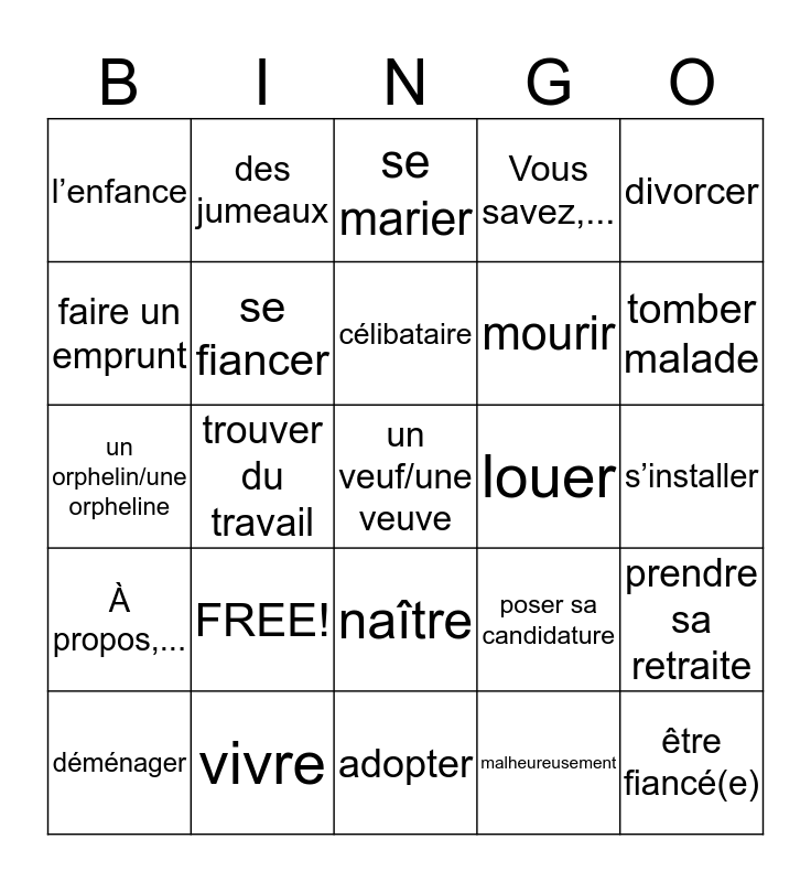 This bingo card has 25 words: FREE!, adopter, célibataire, déménager, divorcer, l’enfance, faire un emprunt, des jumeaux, louer, naître, mourir, un orphelin/une orpheline, poser sa candidature, prendre sa retraite, se fiancer, être fiancé(e), s’installer, se marier, tomber malade, trouver du travail, un veuf/une veuve, vivre, À propos,..., Vous savez,... and malheureusement.