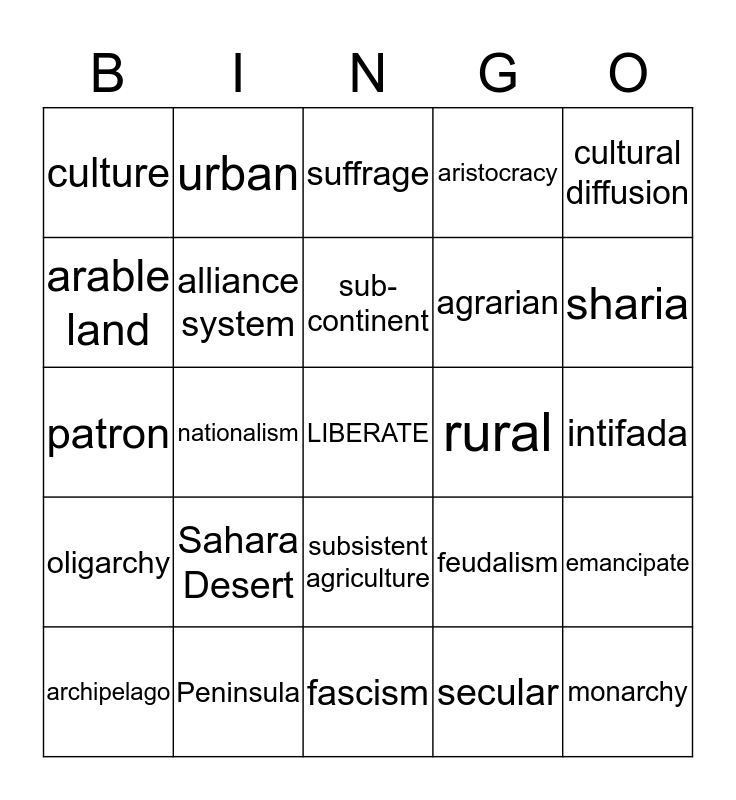 This bingo card has a free space and 24 words: Sahara Desert, Peninsula, sub-continent, archipelago, cultural diffusion, culture, arable land, urban, rural, subsistent agriculture, agrarian, patron, feudalism, emancipate, alliance system, secular, intifada, suffrage, sharia, nationalism, monarchy, oligarchy, aristocracy and fascism.