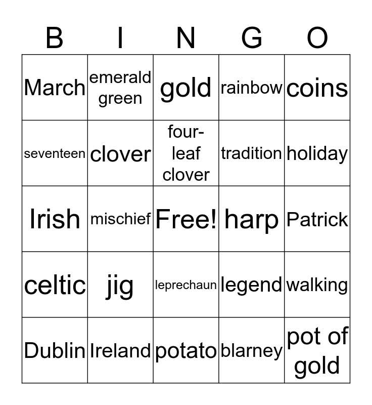 This bingo card has a free space and 34 words: bagpipe, blarney, brogue, celebrate, celtic, clover, coins, Dublin, emerald green, fortune, four-leaf clover, gold, green, good luck, harp, holiday, Ireland, Irish, jig, legend, leprechaun, magic, March, Patrick, potato, pot of gold, rainbow, shamrock, tradition, seventeen, saint, mischief, walking and patron.