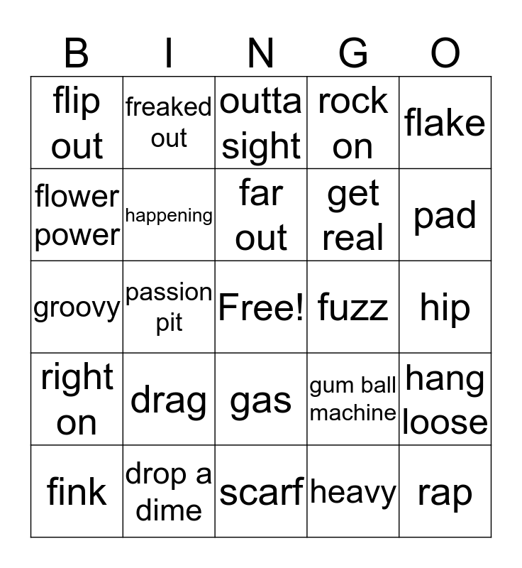 This bingo card has a free space and 24 words: drag, drop a dime, far out, fink, flake, flip out, flower power, freaked out, fuzz, gas, get real, groovy, gum ball machine, hang loose, happening, heavy, hip, outta sight, pad, passion pit, rap, right on, rock on and scarf.