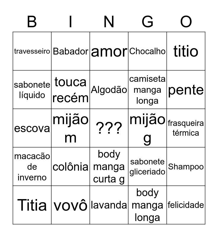 This bingo card has 1 images, a free space and 29 words: Titia, loção, mijão m, carinho, travesseiro, amor, touca recém, colônia, mijão g, vovô, frasqueira térmica, felicidade, lavanda, body manga longa, pente, luva recém nascido, body manga curta g, macacão de inverno, titio, escova, sabonete gliceriado, casaquinho g, camiseta manga longa, sabonete líquido, Chocalho, Babador, Shampoo, Algodão and Talco.