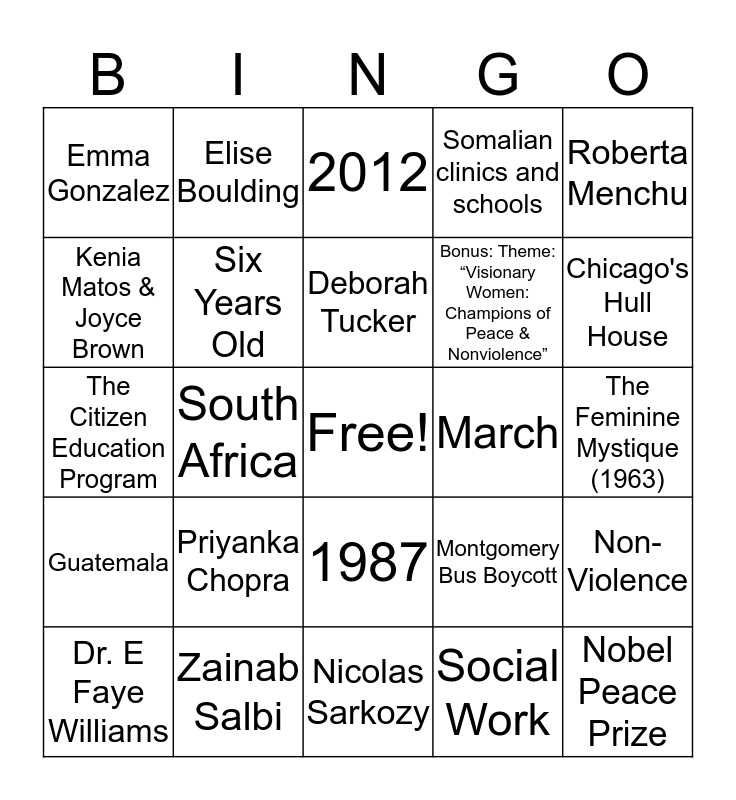This bingo card has a free space and 24 words: Priyanka Chopra, Zainab Salbi, Deborah Tucker, Dr. E Faye Williams, Roberta Menchu, Emma Gonzalez, Kenia Matos & Joyce Brown, Elise Boulding, March, 1987, Bonus: Theme: “Visionary Women: Champions of Peace & Nonviolence”, The Citizen Education Program, Montgomery Bus Boycott, Non- Violence, Six Years Old, Social Work, The Feminine Mystique (1963), 2012, Chicago's Hull House, South Africa, Nobel Peace Prize, Guatemala, Somalian clinics and schools and Nicolas Sarkozy.