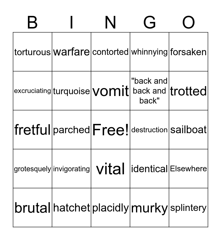 This bingo card has a free space and 24 words: invigorating, hatchet, vomit, brutal, forsaken, torturous, excruciating, warfare, destruction, vital, "back and back and back", fretful, identical, Elsewhere, turquoise, murky, sailboat, contorted, trotted, parched, splintery, grotesquely, whinnying and placidly.