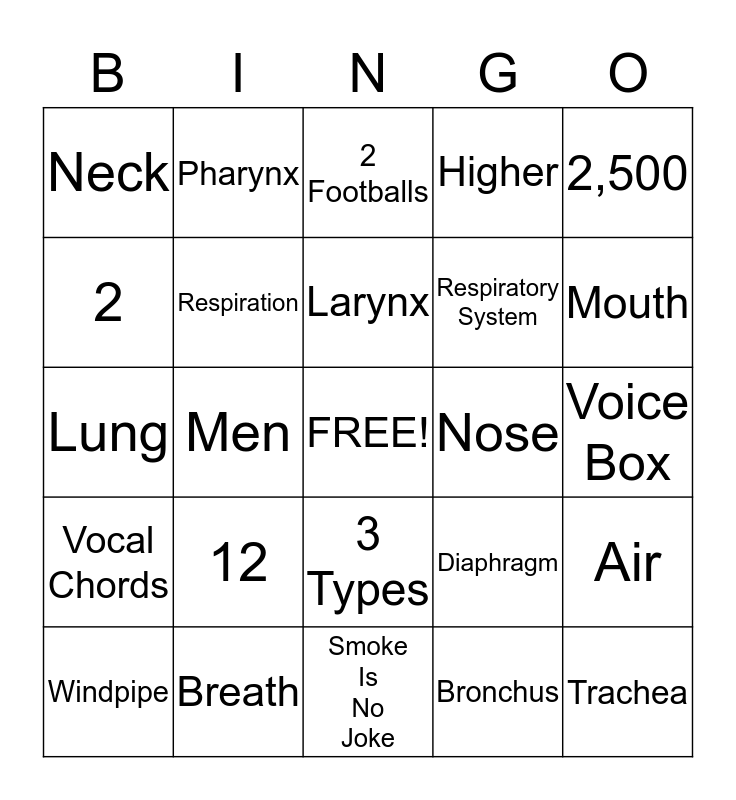 This bingo card has a free space and 24 words: 12, Breath, Larynx, Windpipe, 2,500, Neck, 2, Pharynx, Nose, 3 Types, Respiratory System, Lung, Diaphragm, Air, Respiration, Bronchus, Voice Box, 2 Footballs, Mouth, Men, Trachea, Vocal Chords, Higher and Smoke Is No Joke.