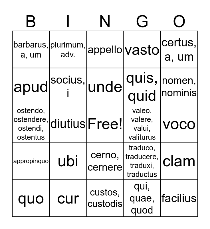 This bingo card has a free space and 24 words: ubi, cur, unde, quo, certus, a, um, barbarus, a, um, apud, plurimum, adv., valeo, valere, valui, valiturus, cerno, cernere, quis, quid, ostendo, ostendere, ostendi, ostentus, traduco, traducere, traduxi, traductus, clam, socius, i, qui, quae, quod, voco, appello, nomen, nominis, diutius, facilius, appropinquo, vasto and custos, custodis.