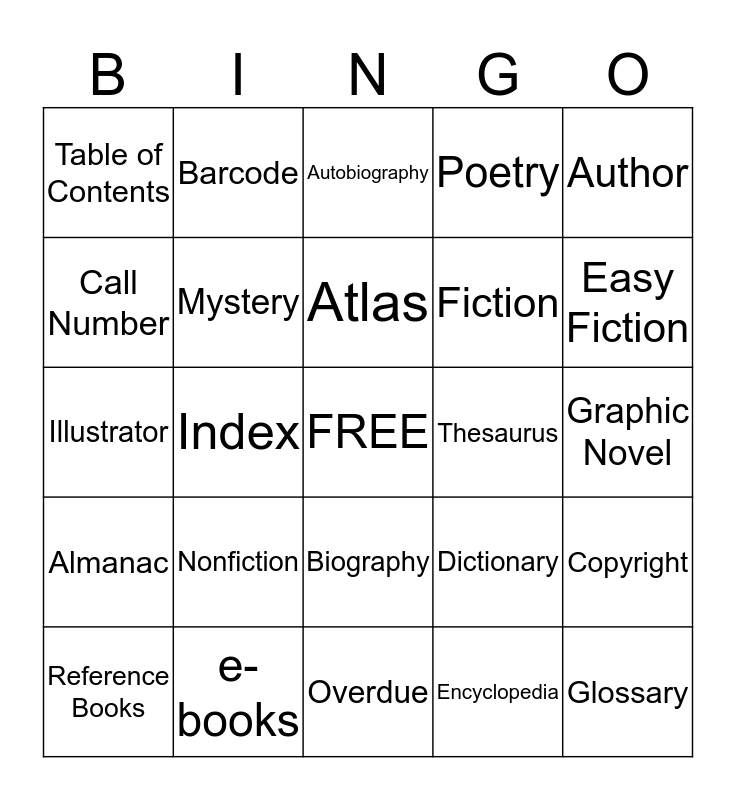 This bingo card has a free space and 24 words: Nonfiction, e-books, Atlas, Reference Books, Author, Table of Contents, Call Number, Barcode, Thesaurus, Biography, Fiction, Illustrator, Dictionary, Copyright, Mystery, Encyclopedia, Graphic Novel, Autobiography, Easy Fiction, Index, Glossary, Almanac, Poetry and Overdue.