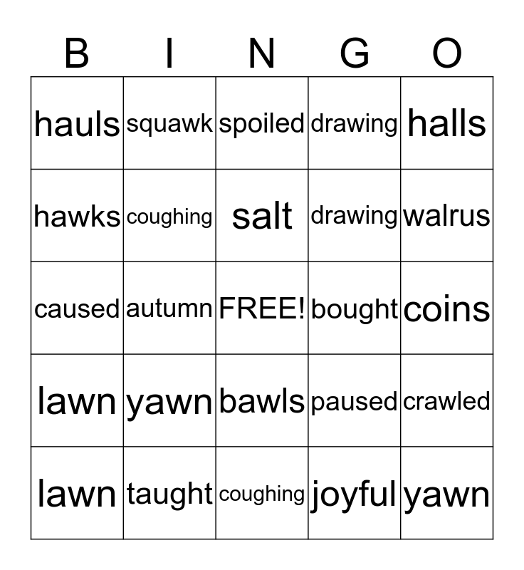 This bingo card has a free space and 24 words: yawn, taught, salt, lawn, halls, hauls, hawks, squawk, bought, bawls, drawing, caused, paused, crawled, coughing, joyful, coins, spoiled, walrus, autumn, yawn, lawn, drawing and coughing.