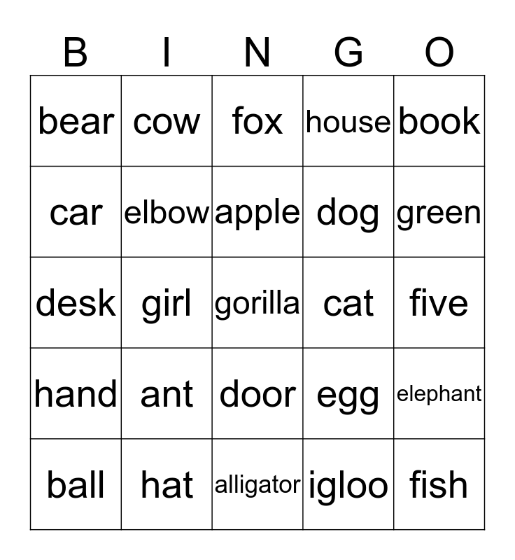 This bingo card has 25 words: ant, alligator, apple, ball, book, bear, car, cow, cat, door, dog, desk, egg, elephant, elbow, fish, five, fox, green, girl, gorilla, hat, hand, house and igloo.