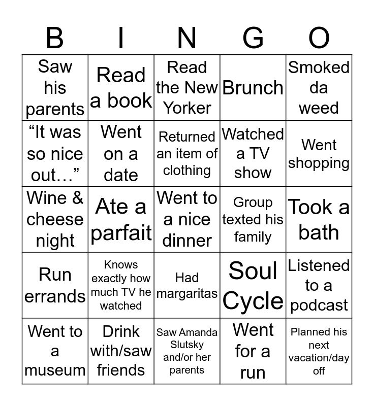 This bingo card has 25 words: Knows exactly how much TV he watched, Saw Amanda Slutsky and/or her parents, Returned an item of clothing, Went to a museum, Smoked da weed, Saw his parents, “It was so nice out…”, Read a book, Group texted his family, Had margaritas, Watched a TV show, Wine & cheese night, Soul Cycle, Listened to a podcast, Went on a date, Planned his next vacation/day off, Took a bath, Read the New Yorker, Went shopping, Ate a parfait, Went to a nice dinner, Drink with/saw friends, Run errands, Brunch and Went for a run.