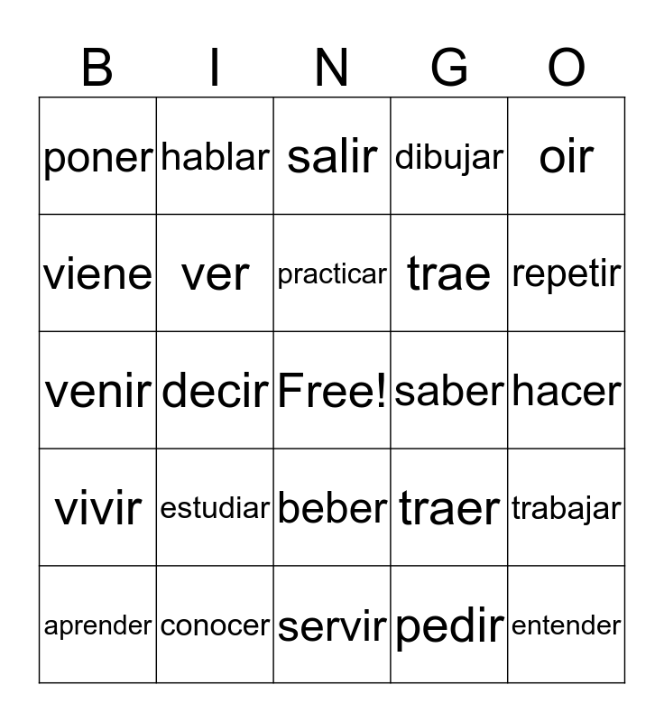 This bingo card has a free space and 29 words: aprender, tener, decir, comer, poner, salir, ver, estudiar, saber, conocer, hacer, entender, servir, pedir, repetir, preferir, beber, vivir, oir, venir, traer, oye, trae, viene, dibujar, hablar, trabajar, practicar and usar.