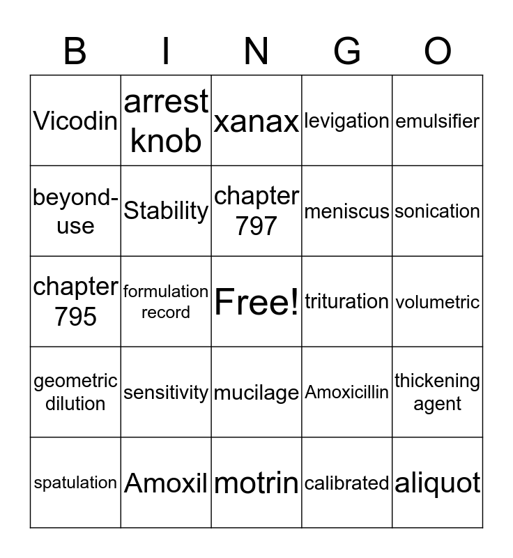 This bingo card has a free space and 24 words: sensitivity, Amoxil, chapter 797, spatulation, emulsifier, Vicodin, beyond-use, arrest knob, trituration, mucilage, meniscus, chapter 795, Amoxicillin, thickening agent, Stability, calibrated, volumetric, xanax, sonication, formulation record, aliquot, geometric dilution, levigation and motrin.