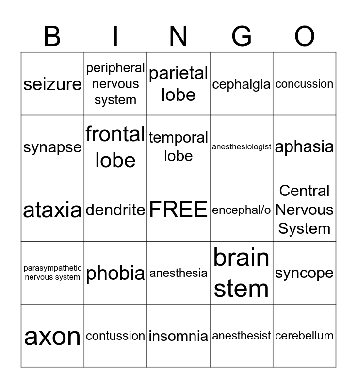 This bingo card has a free space and 37 words: FACE, stroke, meningioma, encephal/o, Central Nervous System, parasympathetic nervous system, dendrite, coma, anesthesiologist, occipital lobe, synapse, frontal lobe, anesthesist, concussion, seizure, contussion, anesthesia, cephalgia, aphasia, ataxia, peripheral nervous system, temporal lobe, sympathetic nervous system, syncope, gray matter, hypothalamus, parietal lobe, mening/o, dysphasia, migraine, concussion, insomnia, brain stem, cerebellum, axon, phobia and klept/o.