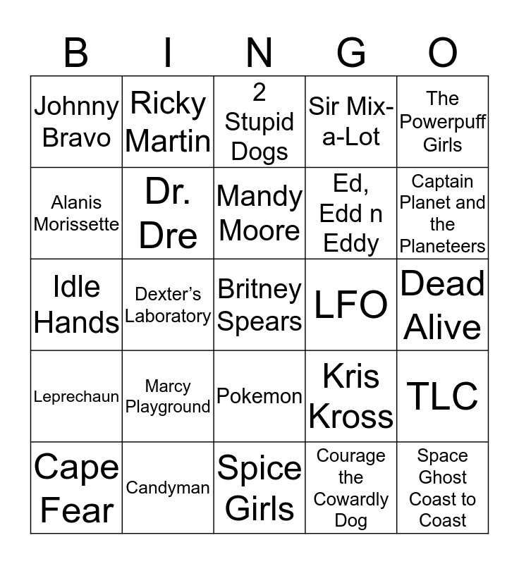 This bingo card has 50 words: Nirvana, Britney Spears, Oasis, Spice Girls, Marcy Playground, Blackstreet, Ricky Martin, Aqua, Alanis Morissette, Hanson, Dr. Dre, Sir Mix-a-Lot, TLC, Kris Kross, Celine Dion, Sheryl Crow, Mandy Moore, LFO, Radiohead, The Powerpuff Girls, Dexter’s Laboratory, Courage the Cowardly Dog, Johnny Bravo, Ed, Edd n Eddy, Cow and Chicken, Space Ghost Coast to Coast, Captain Planet and the Planeteers, Pink and the Brain, 2 Stupid Dogs, Pokemon, Dragon Ball Z, Freakazoid!, Scream, The Blair Witch Project, Candyman, Misery, I Know What You Did Last Summer, The Faculty, Urban Legend, Dead Alive, Army of Darkness, The Craft, Halloween H20, Gremlins 2, Cape Fear, Idle Hands, Demon Knight, Cube, Leprechaun and The Sixth Sense.