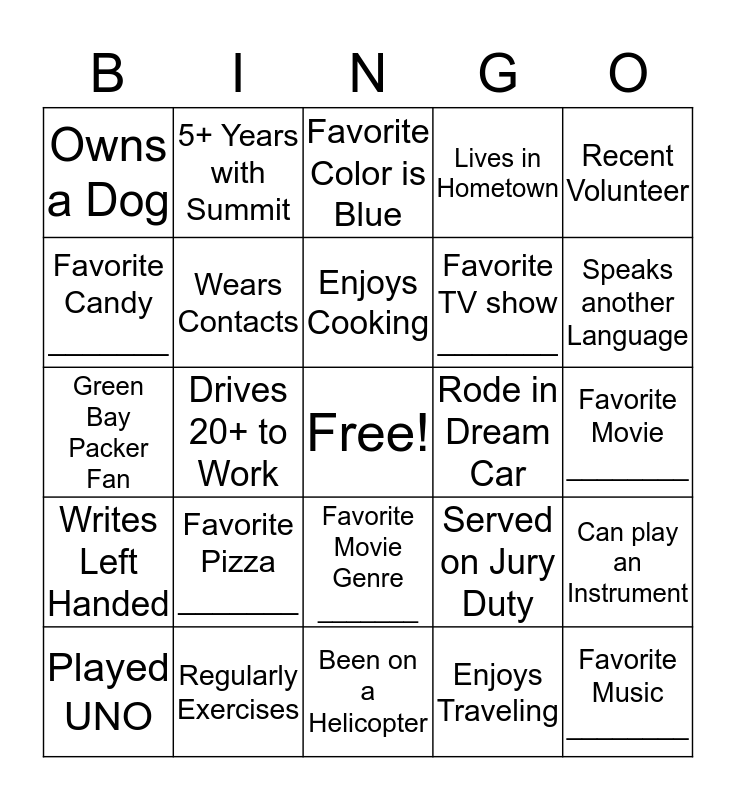 This bingo card has a free space and 24 words: Favorite Pizza _______, Regularly Exercises, Enjoys Cooking, Played UNO, Recent Volunteer, Owns a Dog, Favorite Candy _______, 5+ Years with Summit, Rode in Dream Car, Favorite Movie Genre _______, Favorite TV show _______, Green Bay Packer Fan, Served on Jury Duty, Can play an Instrument, Wears Contacts, Enjoys Traveling, Favorite Movie ________, Favorite Color is Blue, Speaks another Language, Drives 20+ to Work, Favorite Music ________, Writes Left Handed, Lives in Hometown and Been on a Helicopter.