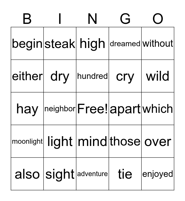 This bingo card has a free space and 24 words: light, sight, hundred, also, without, begin, either, steak, apart, mind, cry, hay, those, over, dry, tie, which, high, wild, neighbor, enjoyed, moonlight, dreamed and adventure.