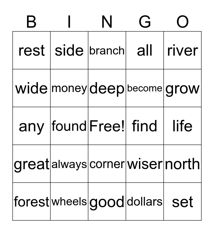 This bingo card has a free space and 24 words: always, wheels, deep, forest, river, rest, wide, side, find, corner, become, any, wiser, north, money, dollars, life, branch, grow, found, set, great, all and good.