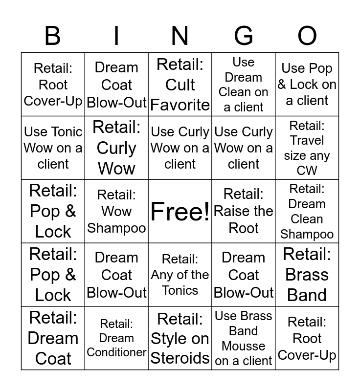 This bingo card has a free space and 24 words: Dream Coat Blow-Out, Retail: Dream Conditioner, Use Curly Wow on a client, Retail: Dream Coat, Use Pop & Lock on a client, Retail: Root Cover-Up, Use Tonic Wow on a client, Dream Coat Blow-Out, Retail: Raise the Root, Retail: Any of the Tonics, Use Curly Wow on a client, Retail: Pop & Lock, Dream Coat Blow-Out, Retail: Brass Band, Retail: Curly Wow, Use Brass Band Mousse on a client, Retail: Dream Clean Shampoo, Retail: Cult Favorite, Retail: Travel size any CW, Retail: Wow Shampoo, Retail: Root Cover-Up, Retail: Pop & Lock, Use Dream Clean on a client and Retail: Style on Steroids.