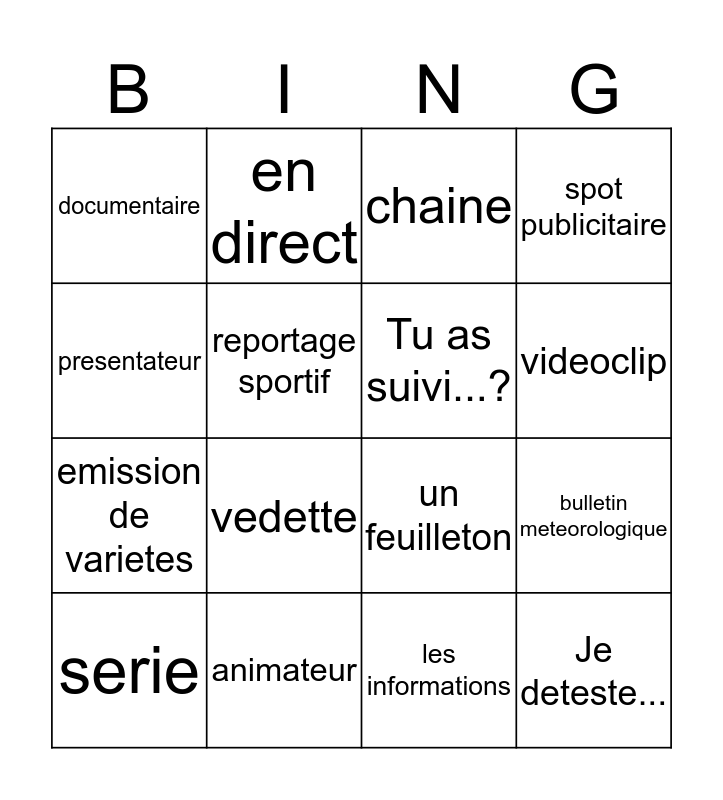 This bingo card has 16 words: animateur, bulletin meteorologique, chaine, documentaire, emission de varietes, en direct, un feuilleton, les informations, presentateur, reportage sportif, serie, spot publicitaire, vedette, videoclip, Tu as suivi...? and Je deteste....