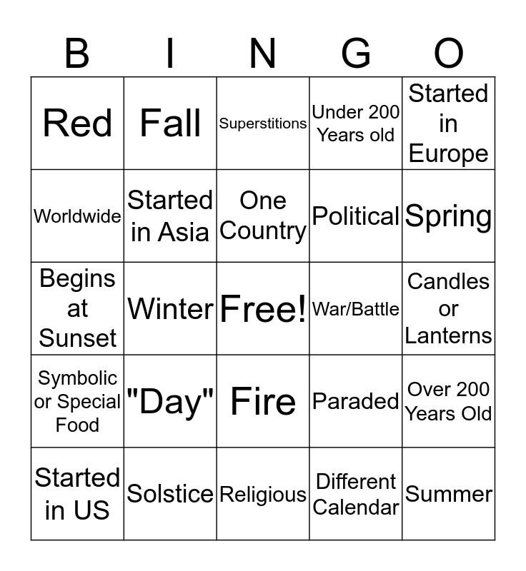 This bingo card has a free space and 24 words: "Day", Solstice, One Country, Started in US, Started in Europe, Red, Worldwide, Fall, War/Battle, Fire, Political, Begins at Sunset, Paraded, Over 200 Years Old, Started in Asia, Different Calendar, Candles or Lanterns, Superstitions, Spring, Winter, Summer, Symbolic or Special Food, Under 200 Years old and Religious.