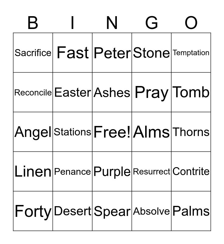 This bingo card has a free space and 24 words: Penance, Desert, Ashes, Forty, Temptation, Sacrifice, Reconcile, Fast, Alms, Purple, Pray, Angel, Resurrect, Contrite, Easter, Absolve, Thorns, Peter, Tomb, Stations, Palms, Linen, Stone and Spear.