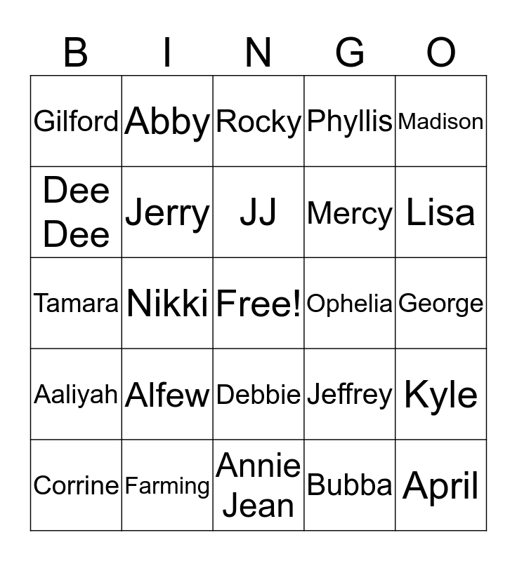 This bingo card has a free space and 24 words: Alfew, Farming, JJ, Corrine, Madison, Gilford, Dee Dee, Abby, Ophelia, Debbie, Mercy, Tamara, Jeffrey, Kyle, Jerry, Bubba, George, Rocky, Lisa, Nikki, April, Aaliyah, Phyllis and Annie Jean.