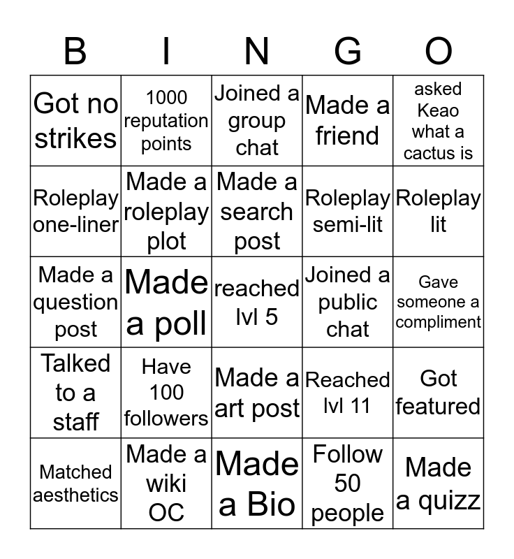 This bingo card has 25 words: Have 100 followers, Made a Bio, Made a search post, Matched aesthetics, asked Keao what a cactus is, Got no strikes, Roleplay one-liner, 1000 reputation points, Joined a public chat, Made a art post, Roleplay semi-lit, Made a question post, Reached lvl 11, Got featured, Made a roleplay plot, Made a quizz, Gave someone a compliment, Joined a group chat, Roleplay lit, Made a poll, reached lvl 5, Made a wiki OC, Talked to a staff, Made a friend and Follow 50 people.