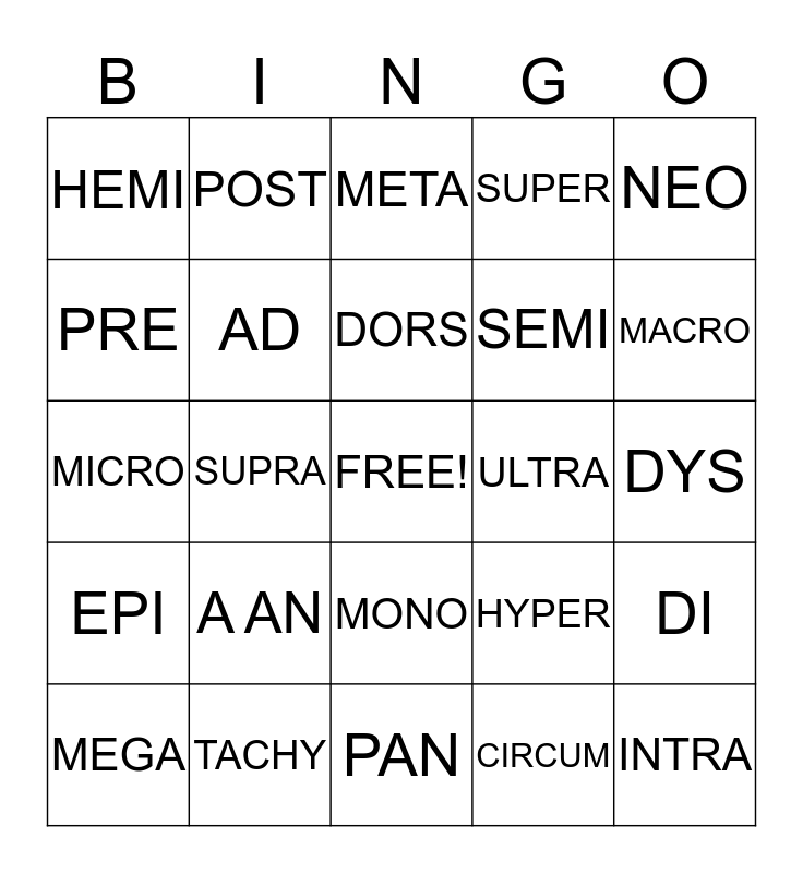 This bingo card has a free space and 24 words: A AN, TACHY, DORS, MEGA, NEO, HEMI, PRE, POST, ULTRA, MONO, SEMI, MICRO, HYPER, DI, AD, CIRCUM, DYS, META, MACRO, SUPRA, INTRA, EPI, SUPER and PAN.