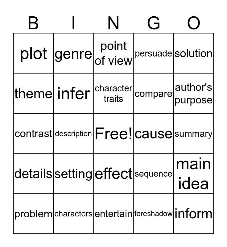 This bingo card has a free space and 24 words: setting, characters, character traits, problem, solution, plot, theme, genre, cause, effect, compare, contrast, sequence, main idea, infer, foreshadow, summary, point of view, author's purpose, description, inform, details, persuade and entertain.