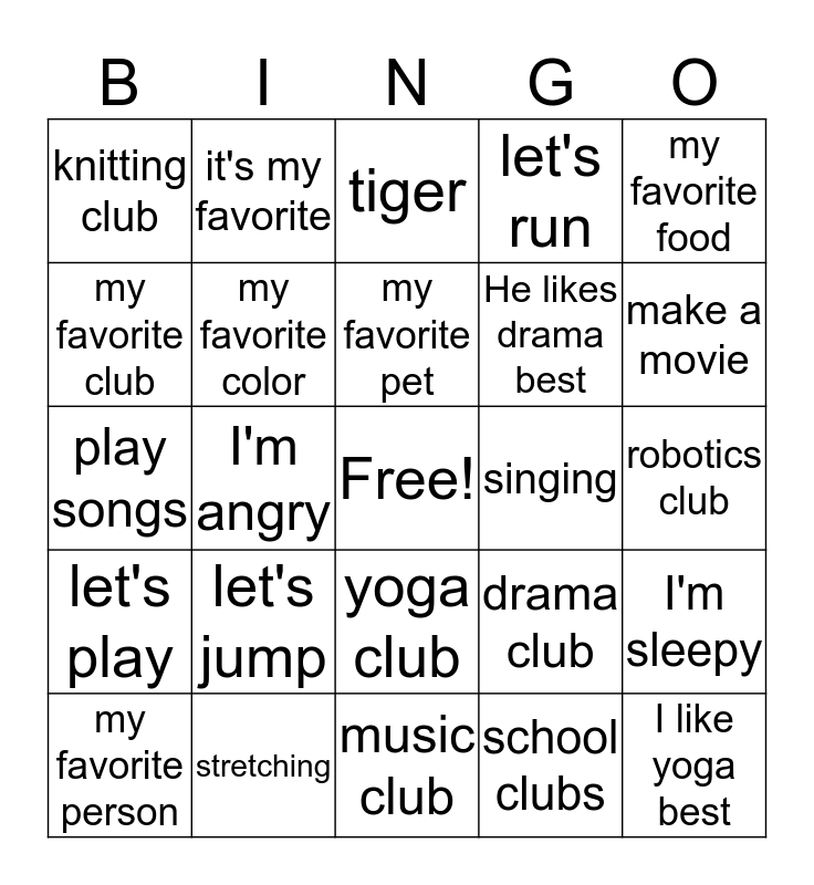 This bingo card has a free space and 33 words: I'm so-so, I'm fine, I'm angry, where are you?, let's play, my favorite color, my favorite food, my favorite person, it's my favorite, do you like it?, my favorite pet, tiger, cat, computer, singing, make a movie, stretching, play songs, let's jump, drama club, yoga club, magic club, knitting club, robotics club, music club, I like yoga best, let's run, He likes drama best, my favorite club, I'm sleepy, I'm happy, school clubs and which club.