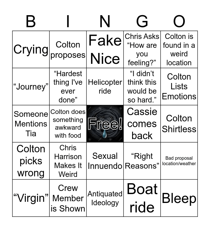 This bingo card has a free space and 32 words: Boat ride, “Needed me time”, Colton does something awkward with food, Jump cut to “x days/weeks later”, Colton picks wrong, “Hardest thing I've ever done”, Colton is found in a weird location, Bad proposal location/weather, Colton proposes, Problematic Dad, Helicopter ride, Fake Nice, Colton Gets Dumped, Colton gets laid, Cassie comes back, Chris Harrison says “Dramatic”, “Virgin”, Someone Mentions Tia, Sexual Innuendo, Chris Harrison Makes It Weird, “Right Reasons”, “The Most Dramatic Season Yet”, Colton Shirtless, Crew Member is Shown, Bleep, Chris Asks “How are you feeling?”, “I didn’t think this would be so hard.”, “Journey”, Crying, Antiquated Ideology, pls be gay and Colton Lists Emotions.
