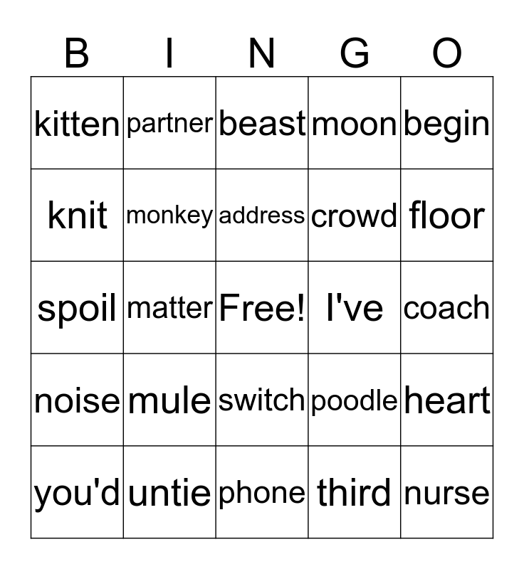 This bingo card has a free space and 24 words: mule, untie, address, you'd, begin, kitten, knit, partner, I've, switch, crowd, spoil, poodle, heart, monkey, third, coach, beast, floor, matter, nurse, noise, moon and phone.