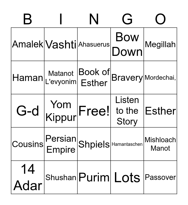 This bingo card has a free space and 24 words: Persian Empire, Shushan, Book of Esther, 14 Adar, Megillah, Amalek, Haman, Vashti, Listen to the Story, Shpiels, Bravery, G-d, Hamantaschen, Mishloach Manot, Matanot L'evyonim, Lots, Esther, Ahasuerus, Mordechai,, Yom Kippur, Passover, Cousins, Bow Down and Purim.