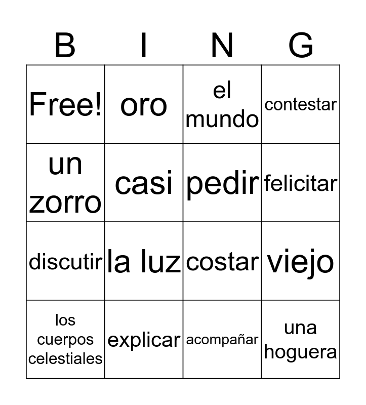 This bingo card has 18 words: un zorro, explicar, el mundo, contestar, discutir, oro, costar, felicitar, Free!, la luz, acompañar, viejo, los cuerpos celestiales, casi, pedir, una hoguera, preguntar and gritar.