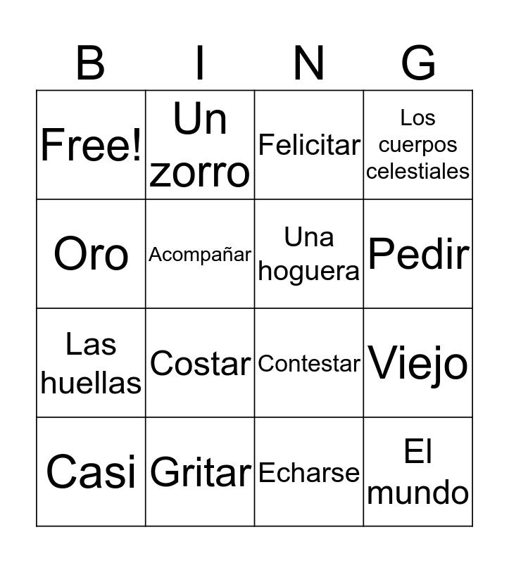 This bingo card has 19 words: Casi, Preguntar, Felicitar, Viejo, La Luz, Un zorro, Echarse, Los cuerpos celestiales, Free!, Costar, Una hoguera, Pedir, Las huellas, Gritar, Contestar, El mundo, Oro, Acompañar and Discutir.