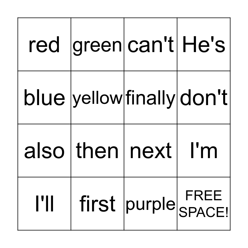 This bingo card has 16 words: first, I'm, can't, red, also, green, next, purple, blue, yellow, I'll, He's, then, don't, finally and FREE SPACE!.