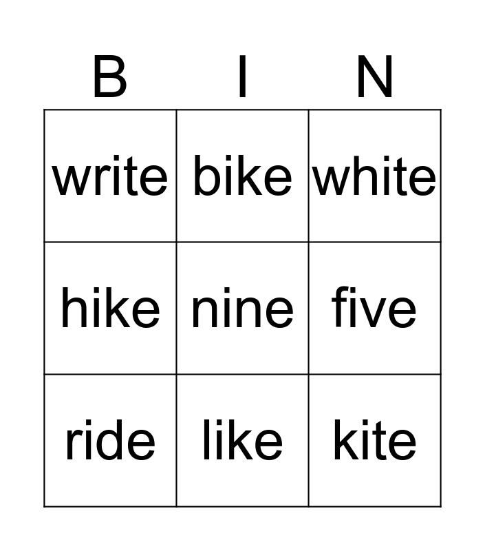 This bingo card has a free space and 11 words: time, like, kite, ride, bike, white, five, drive, hike, write and invite.