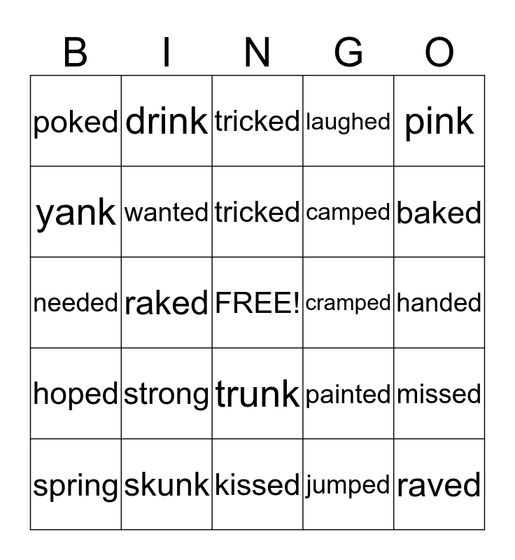 This bingo card has a free space and 24 words: strong, skunk, tricked, spring, pink, poked, yank, drink, cramped, trunk, camped, needed, painted, missed, wanted, jumped, handed, tricked, baked, raked, raved, hoped, laughed and kissed.